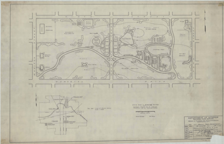 At one point, the local women’s club installed a boulder with a plaque commemorating soldiers that hailed from Delaware County who fought in wars that took place by that point, such as the Civil War, Spanish-American War, and others. Also of note is a comment made in 1966 in a newspaper column that calls the purchase of Heekin’s land as the “best bargain Muncie ever got.” (The Star Press) Some of the original plans for the park shows that the city had wanted to be more ambitious, as plans were made for a pool, a large amphitheater, and a small area called monkey island, but many of these ideas never came to fruition.