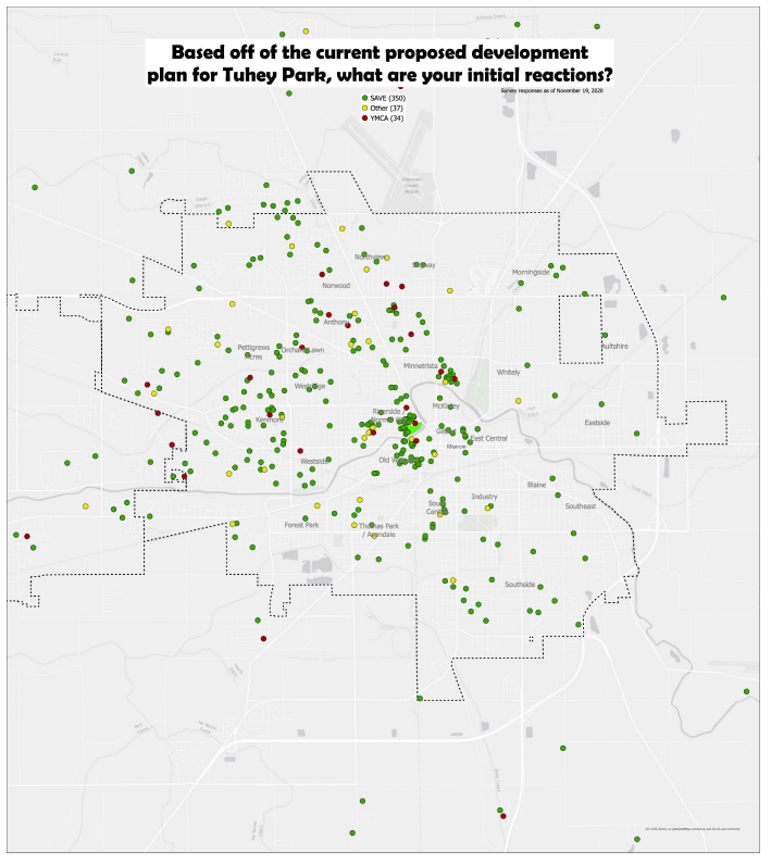 Thinking about Tuhey without being prompted to do so is not exclusive to such conversations, either. When surveyed about whether or not Tuhey Park should be developed by the YMCA, a fairly heavy majority responded with disapproval, with a ratio of nearly 11 to 1 wanting to keep Tuhey open to the public (Save Tuhey Map). People frequently responded to surveys regarding the parks as a whole with clear desire for the YMCA – and other private entities – to stay away from Tuhey, even when not prompted to comment on the status of the project (Parks Plan 2021), with the most vehement of detractors commenting that the plan was “bullshit” and they wanted no part in it. It is a crucial issue and one that the people who use the parks refuse to ignore. But what is most interesting about these responses is not just that they want to “save Tuhey,” but rather the location from where they were coming and where those respondents lived. The densest clusters of respondents who said “No” to having the YMCA build is found, perhaps unsurprisingly, within the neighborhood of Riverside-Normal City and just beyond around McCulloch Park to the east. It does serve that neighborhood, and any change to it would affect the “backyard” of Riverside. Yet what can also be seen is that people all around Muncie have strong opinions on the status of Tuhey, dotting the map as individuals in all corners of the city, often also wanting to keep the YMCA out. Further still, people outside of Muncie border responded to this survey, again often with “No.” To say that Tuhey is important to the Riverside-Normal City neighborhood would itself be an understatement, but it would also appear that Tuhey as a park, a desired open space, reaches far beyond the neighborhood it is officially sanctioned to “service,” instead playing an important role in the lives of people far and beyond its borders. It is as if those who come to Tuhey take a part of it with them.